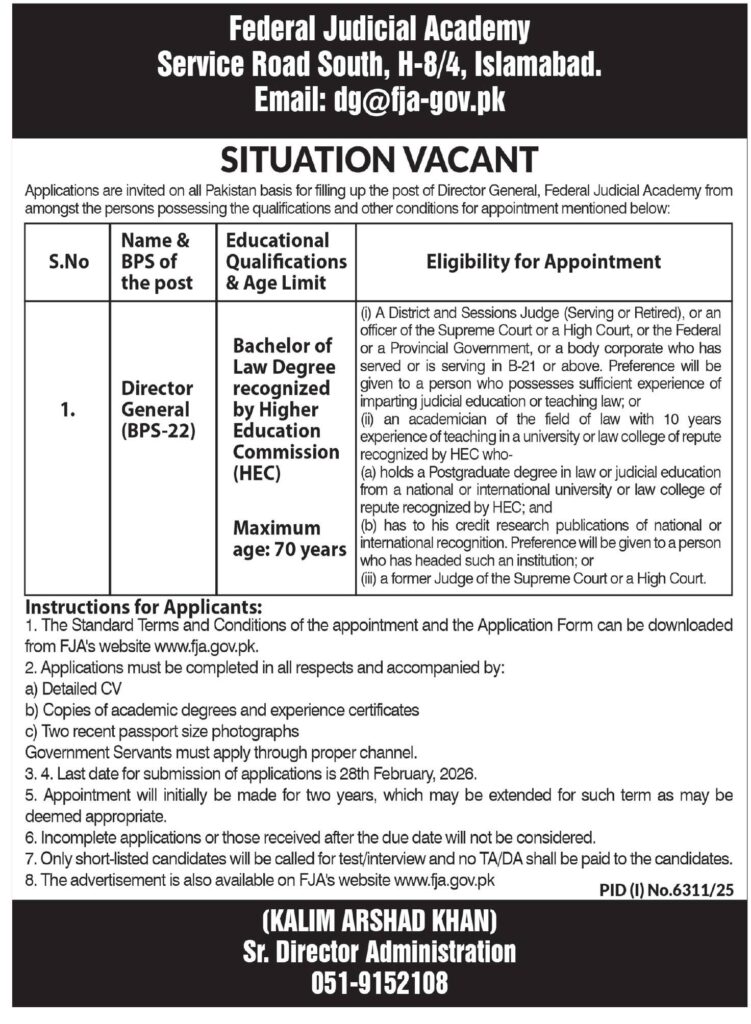 Federal Judicial Academy Islamabad jobs 2026 for Director General BPS-22. Check law degree requirement, eligibility, age limit, tenure, and apply by 28 Feb 2026.