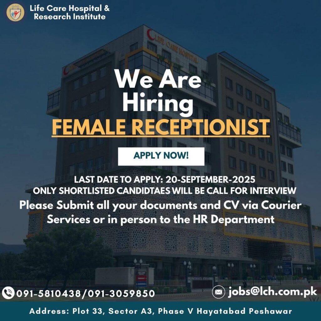 | Female Receptionist | Life Care Hospital, Peshawar | 20th September 2025 | Submit CV and documents via Courier or in person to the HR Department |
