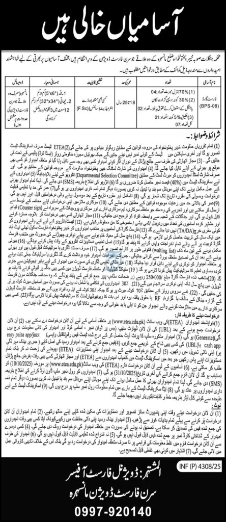 | Forest Guard | BPS-08 | 4 | F.Sc or Equivalent | 18-25 Years |