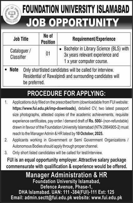 “Apply for the Cataloguer/Classifier position at Foundation University Islamabad. Bachelor’s degree in Library Science with 3 years of experience required. Apply by 10th October 2025 and join a prestigious educational institution.”