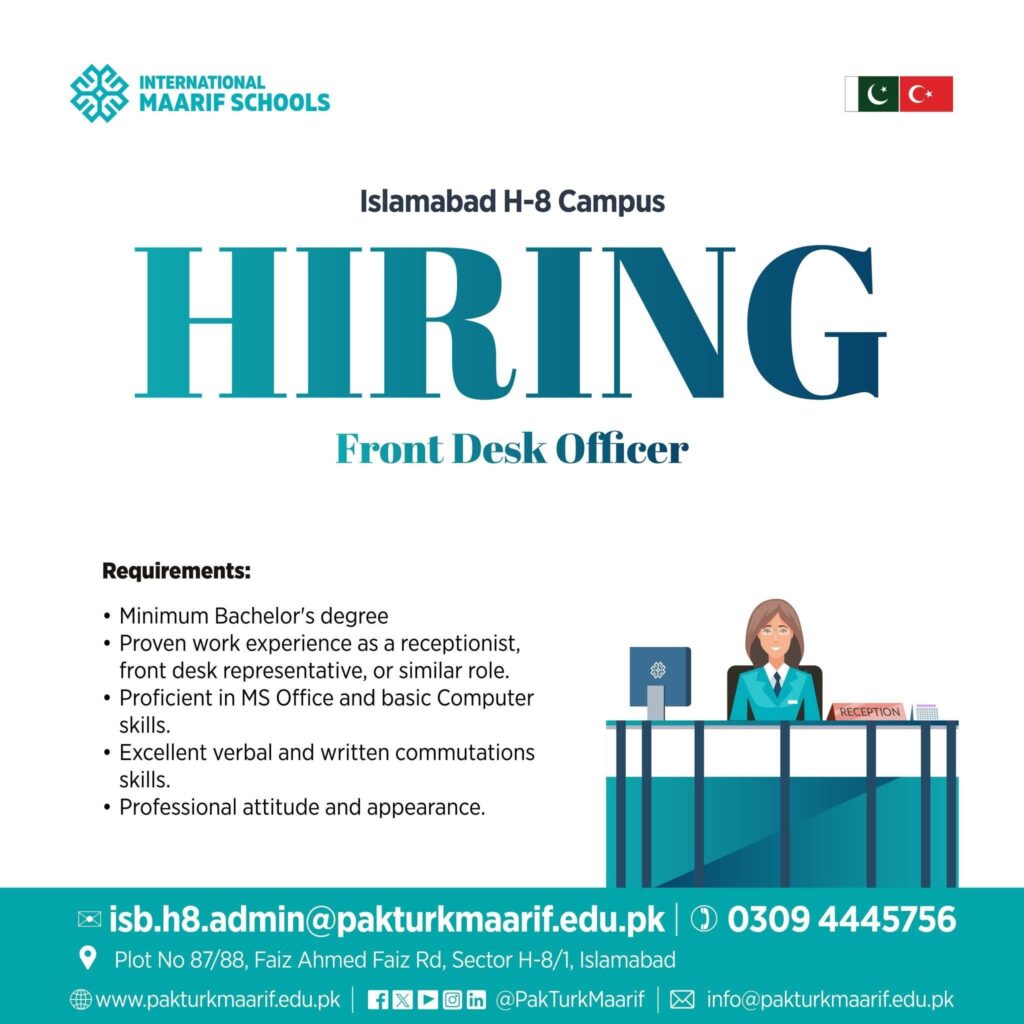 | Front Desk Officer | Islamabad H-8 Campus | Minimum Bachelor’s DegreeExperience as receptionist/front desk representativeProficient in MS Office and communication skills | Email: isb.h8.admin@pakturkmaarif.edu.pkPhone: 0309 4445756 |
