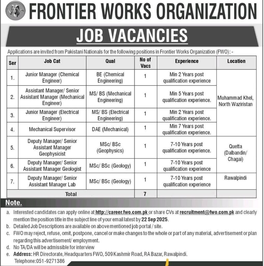 Frontier Works Organization (FWO), a prestigious government engineering and construction organization, is inviting applications from qualified Pakistani nationals for multiple technical and managerial roles. Positions are available across various locations including North Waziristan, Quetta, Chagai, and Rawalpindi. This is an excellent opportunity to work with a leading organization involved in major national development projects.