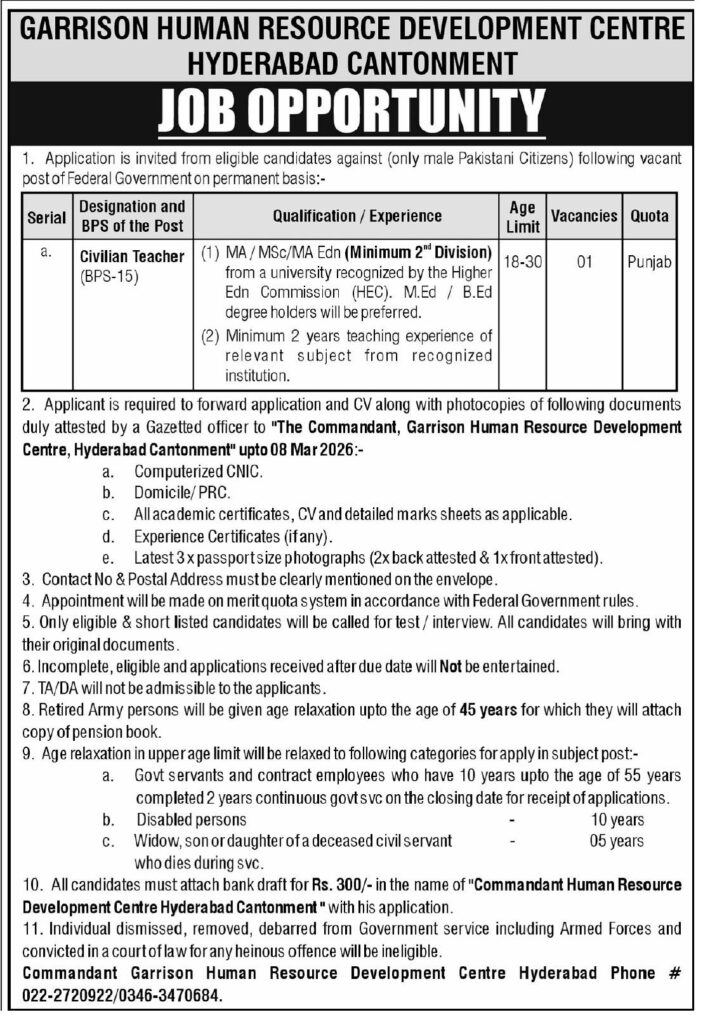 Apply for Garrison HRDC Hyderabad Cantonment Jobs 2026. Civilian Teacher BPS-15 vacancy on permanent basis. Check eligibility criteria, age limit, quota, application process and deadline details.