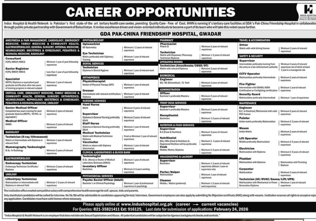GDA Pak-China Friendship Hospital Gwadar announces multiple healthcare and support staff jobs 2026 under Indus Hospital Network. Apply online before February 24, 2026 for consultant, nursing, pharmacy, technical, and administrative positions.