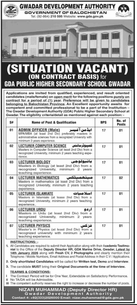 Gwadar Development Authority announces contract-based teaching and administrative jobs at GDA Public Higher Secondary School Gwadar. BPS-17 lecturer and admin officer vacancies for qualified candidates from Balochistan. Apply before January 14, 2026.