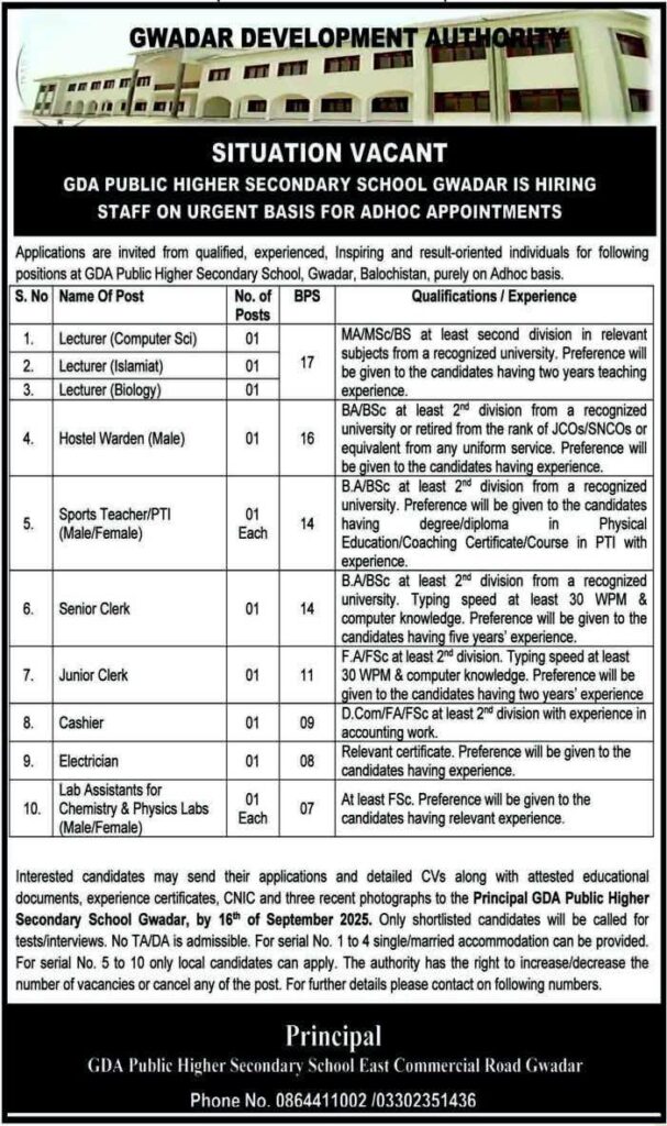 GDA Public Higher Secondary School Gwadar has announced new jobs in Gwadar 2025 on an urgent basis. Vacancies are available for Lecturers (Computer Science, Islamiat, Biology), Hostel Warden, Sports Teacher/PTI, Clerks, Cashier, Electrician, and Lab Assistants. Both male and female candidates with the required qualifications and teaching/administrative experience can apply.