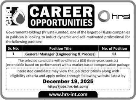 Apply now for the General Manager (Engineering & Process) position at Government Holdings (Private) Limited. Competitive salary and benefits. Deadline: 19th December 2025.