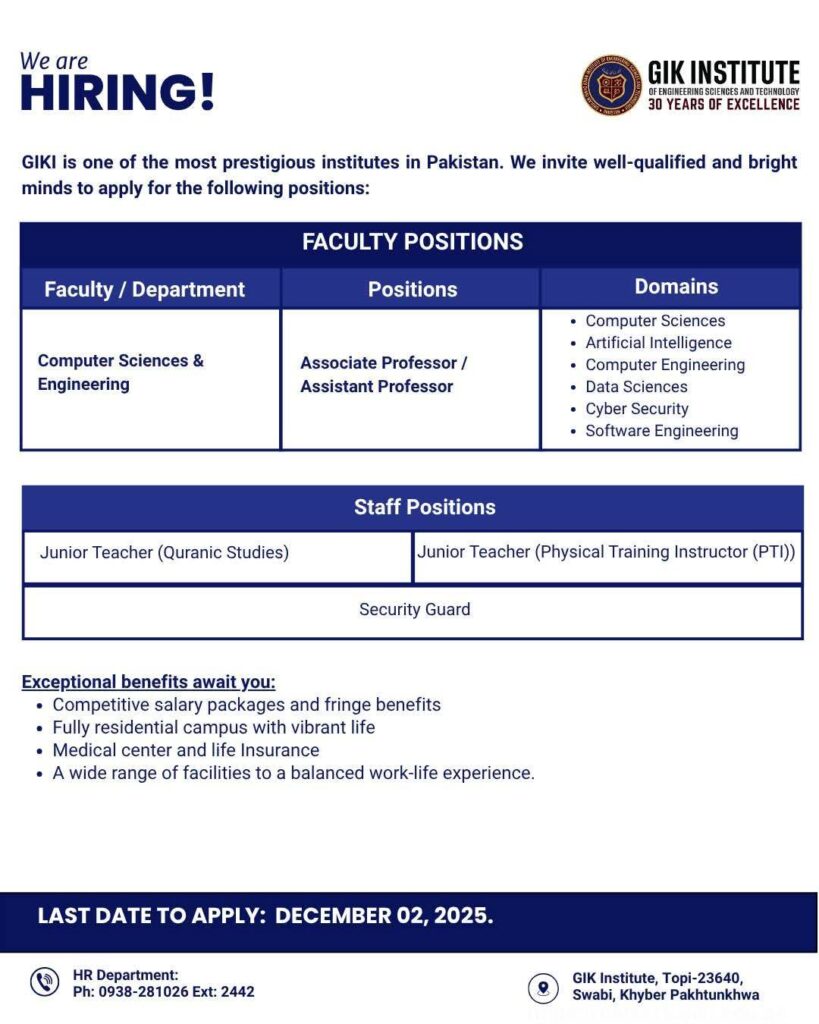 GIK Institute Swabi is hiring Faculty (Asst./Assoc. Professor) in Computer Sciences, AI, & Cyber Security, plus Teachers & Security Guards. Apply by December 02, 2025.