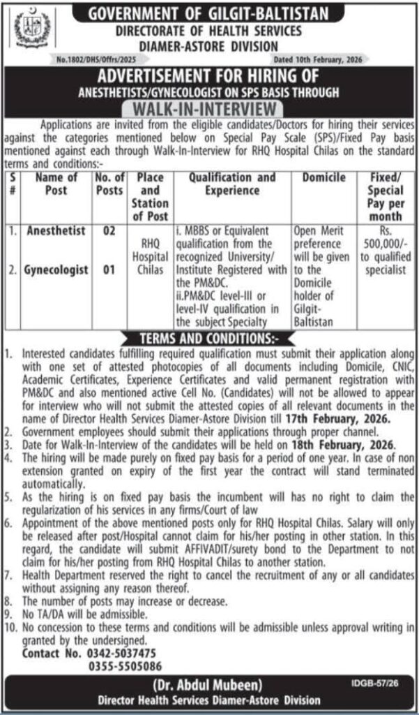 Apply for Gilgit Baltistan Directorate of Health Services Jobs 2026 for Anesthetist and Gynecologist on SPS basis at RHQ Hospital Chilas. Check eligibility, salary, interview date and application details.