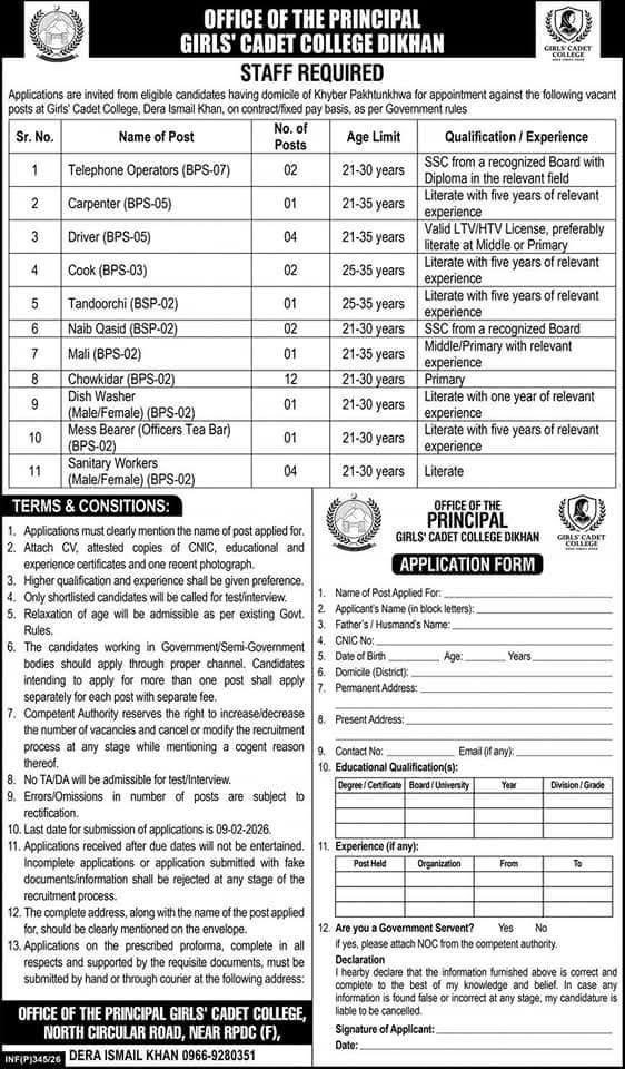 Girls’ Cadet College Dera Ismail Khan invites applications for multiple staff positions, including Telephone Operators, Drivers, Carpenters, and more. Apply by 31st January 2026 for contract-based roles. Full details on qualifications and experience requirements included.