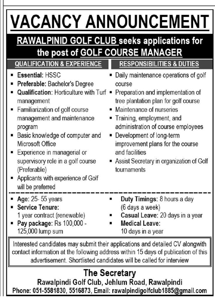 - Send applications and CVs to Rawalpindi Golf Club, Jehlum Road, Rawalpindi or via email: rawalpindigolflclub1885@gmail.com.