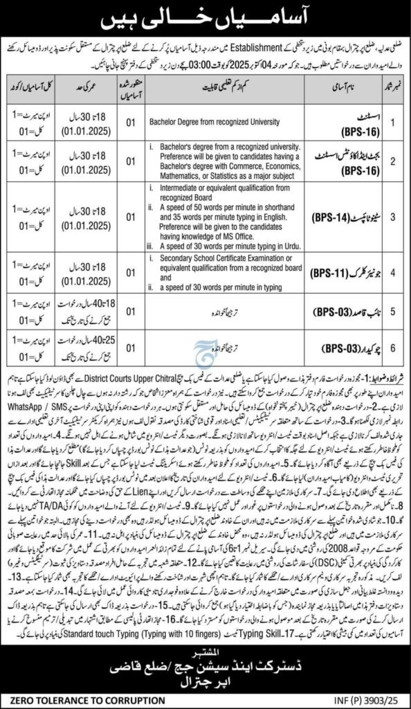 District Courts Upper Chitral is hiring for multiple vacancies including Assistant (BPS-16), Junior Scale Stenographer, Computer Operator, Junior Clerk, Naib Qasid, and Chowkidar. Both male and female candidates with domicile of District Upper Chitral are eligible to apply. Applications must be submitted by October 4, 2025, before 3:00 PM. Preference will be given to candidates with relevant typing speed, computer proficiency, and academic qualifications.