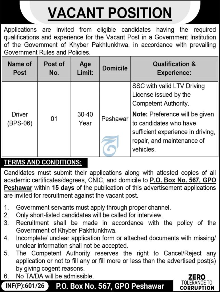 | 1 | Driver | BPS-06 | 30–40 Years | Peshawar | SSC with valid LTV Driving License issued by competent authority | Preference to candidates with experience in driving, vehicle repair, and maintenance | 01 |