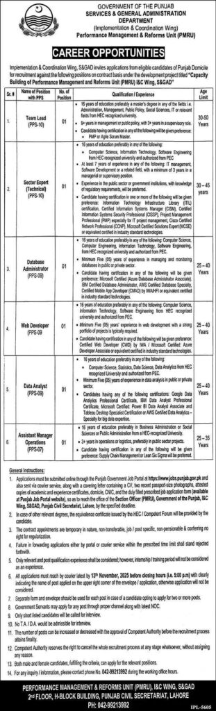 Apply now for various positions with the Government of Punjab in the Performance Management & Reforms Unit (PMRU). Open positions include Team Lead, Sector Expert, Database Administrator, Web Developer, Data Analyst, and Assistant Manager Operations. Submit your application by November 13, 2025.