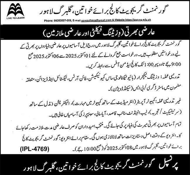 Govt College Lahore Female Staff Recruitment: Apply for Teaching & Non-Teaching Positions (October 2025)