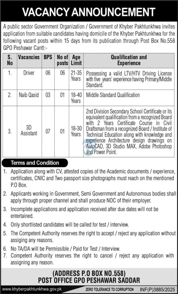 A public sector organization under the Government of Khyber Pakhtunkhwa is accepting applications from eligible candidates with KPK domicile for multiple vacancies. Positions are available for Driver, Naib Qasid, and 3D Assistant. Apply within 15 days of the advertisement through P.O. Box No. 558, GPO Peshawar Saddar. Preference will be given to candidates with relevant qualifications and experience.