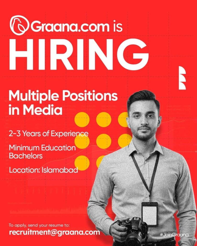 Graana.com is hiring for multiple Media positions in Islamabad. Requires a Bachelor’s degree and 2-3 years of relevant experience. Send your resume to recruitment@graana.com.