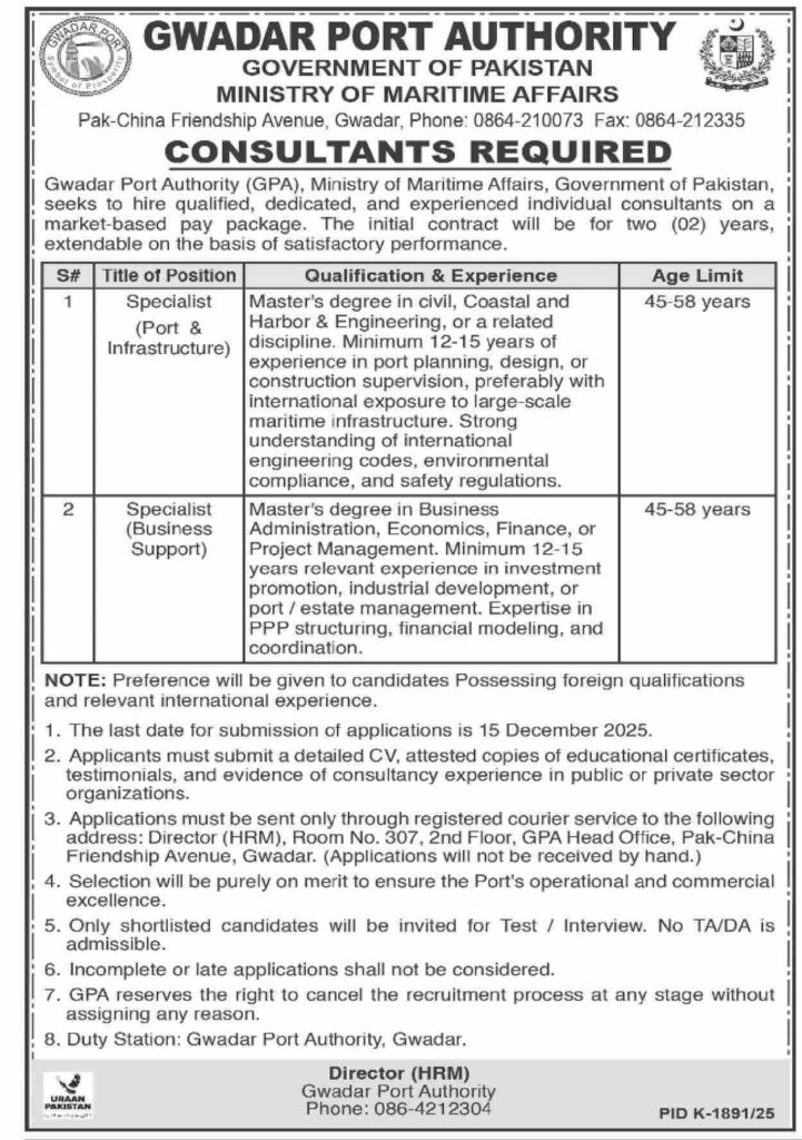 - Director (HRM), Gwadar Port Authority, Room No. 307, 2nd Floor, GPA Head Office, Pak-China Friendship Avenue, Gwadar.