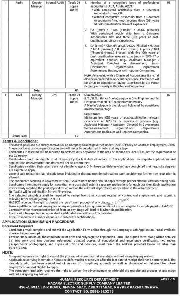 HAZECO Abbottabad Jobs! Apply for 15 Manager & Deputy Manager vacancies in Finance, HR, Legal, and IT on contract basis. Experienced professionals must apply online by 02-12-2025.