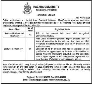 Hazara University invites applications for Assistant Professor and Lecturer in Pharmacy positions. Apply by March 14, 2026. Explore qualifications, experience, and application details.