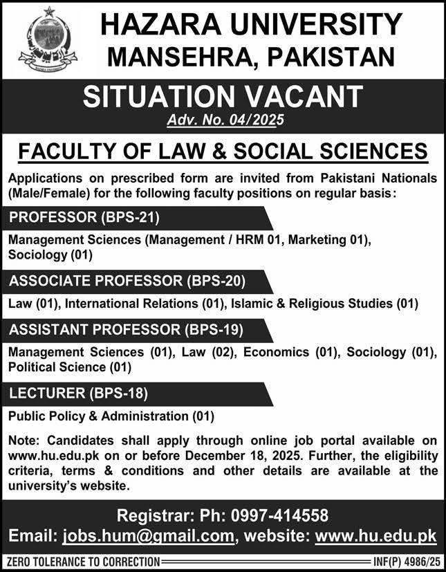 Apply for faculty jobs at Hazara University Mansehra. Vacancies available for Professor, Associate Professor, Assistant Professor, and Lecturer in Management Sciences, Law, IR, Sociology, Economics, and more. Apply online before 18 December 2025.