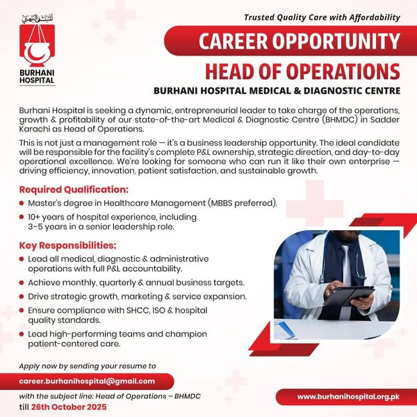 “Burhani Hospital is seeking a dynamic and experienced Head of Operations to lead their Medical & Diagnostic Centre in Karachi. Apply now with a Master’s degree in Healthcare Management and 10+ years of experience in the hospital industry. Submit your CV by October 26, 2025.”