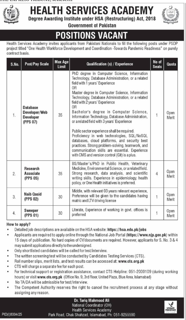 Apply for Health Services Academy HSA Jobs 2026 in Pakistan. Latest government contract vacancies for Database Developer, Research Associate, Naib Qasid, and Sweeper. Check eligibility, qualifications, and application deadline.