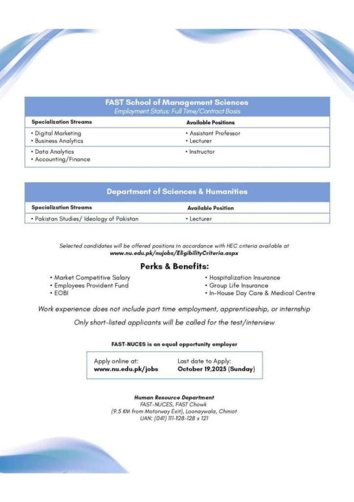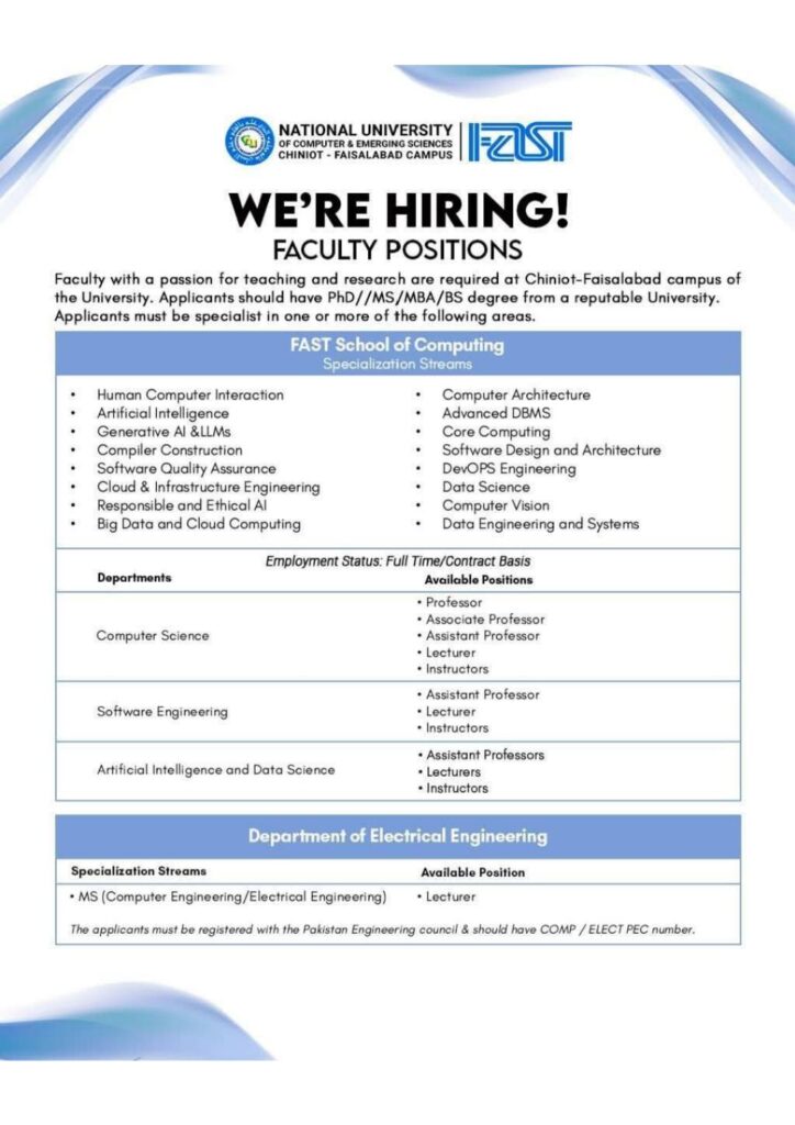 Join the National University of Computer & Emerging Sciences (FAST-NUCES) Chiniot-Faisalabad Campus for exciting faculty positions in specialized fields like Artificial Intelligence, Software Engineering, Data Science, Digital Marketing, and more. Apply for Professor, Lecturer, and Instructor roles in various departments including Computer Science, Software Engineering, Management Sciences, and Electrical Engineering. Competitive salaries, employee benefits, and work-life balance await the selected candidates. Last date to apply: October 19, 2025.