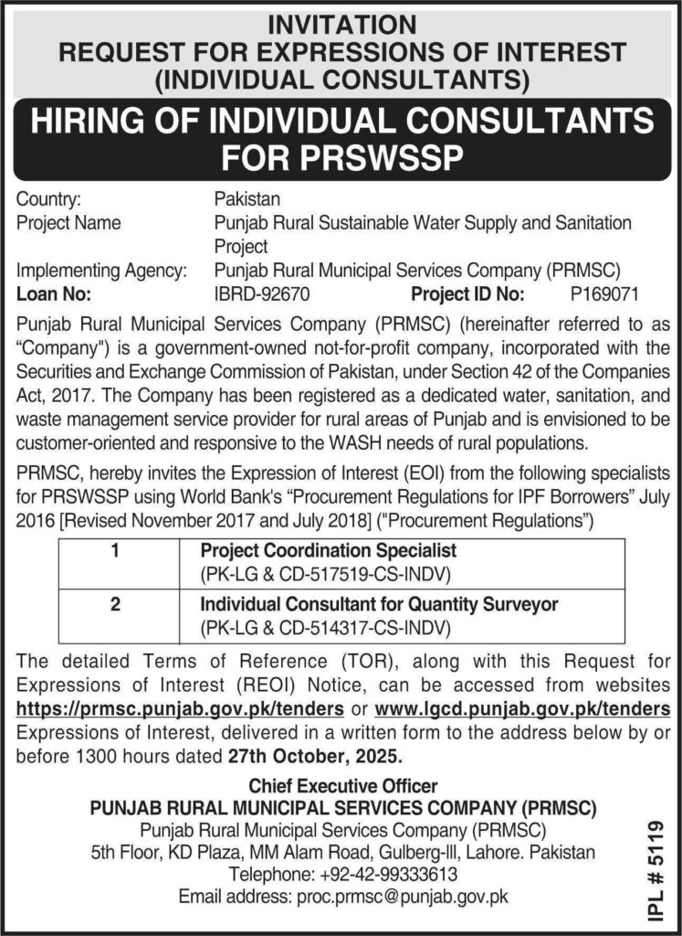 Join the Punjab Rural Municipal Services Company for exciting consulting opportunities. Apply for Project Coordination Specialist and Quantity Surveyor positions for the Punjab Rural Sustainable Water Supply and Sanitation Project. Apply before October 27, 2025.