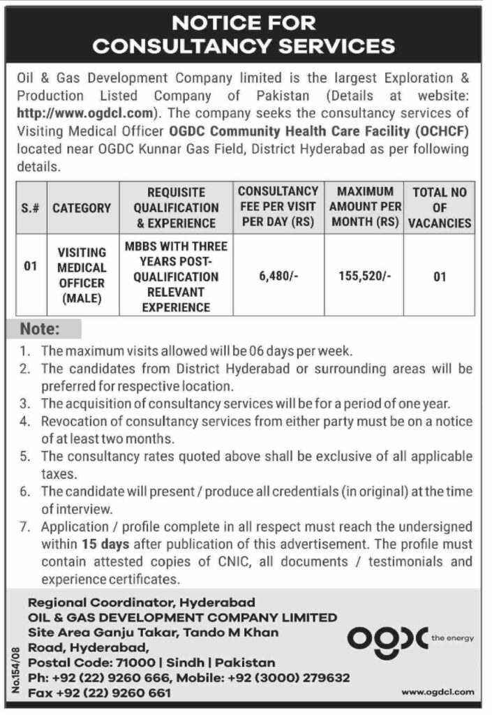 Oil & Gas Development Company Limited (OGDCL), Pakistanβs largest exploration and production company, is inviting applications for the consultancy position of Visiting Medical Officer (Male) at its Community Health Care Facility (OCHCF) near Kunnar Gas Field, District Hyderabad. Candidates with MBBS and relevant post-qualification experience are encouraged to apply. This is a contractual consultancy role with attractive daily and monthly compensation. Preference will be given to candidates from Hyderabad and nearby areas.