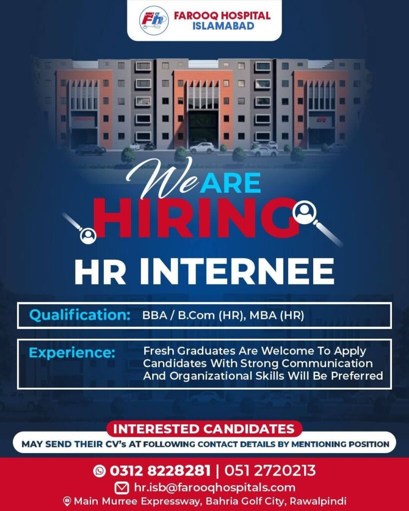 Farooq Hospital Islamabad is hiring an HR Intern. Fresh graduates with a BBA, B.Com, or MBA in HR and strong communication and organizational skills are encouraged to apply. Apply now!