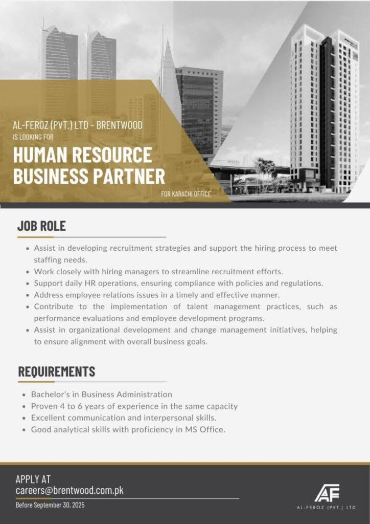 “Al-Feroz (PVT) LTD is hiring a Human Resource Business Partner for their Karachi office. The role involves developing recruitment strategies, supporting HR operations, and contributing to talent management practices. Apply now for this dynamic HR opportunity.”