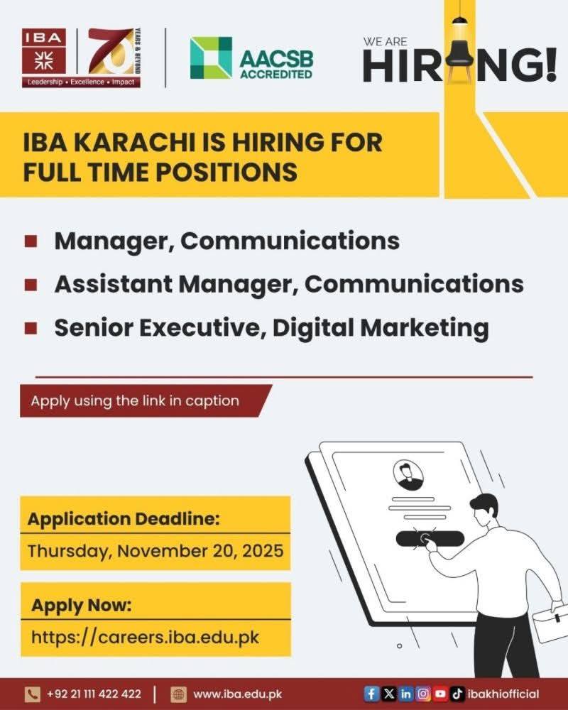 IBA Karachi is hiring for full-time positions! Apply for Manager, Communications, Assistant Manager, Communications, or Senior Executive, Digital Marketing roles at the AACSB-accredited Institute of Business Administration. Build your career at a top university in Karachi. Deadline: November 20, 2025. Apply online now!