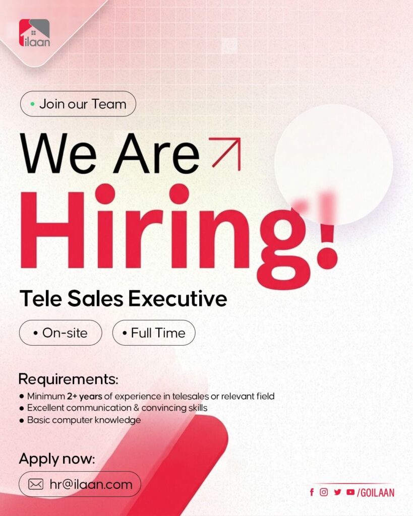 Join Ilaan.com as a Tele Sales Executive. Full-time, on-site roles for candidates with 2+ years of sales experience. Apply now to grow your career in real estate sales.