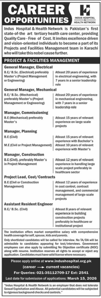 Explore career opportunities at Indus Hospital & Health Network in Karachi. Apply for various managerial and engineering roles in project and facilities management. Submit applications by March 15, 2026.