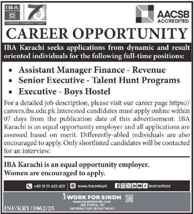 Apply for IBA Karachi full-time positions including Assistant Manager Finance (Revenue), Senior Executive Talent Hunt Programs, and Executive Boys Hostel. Submit online applications within 7 days.