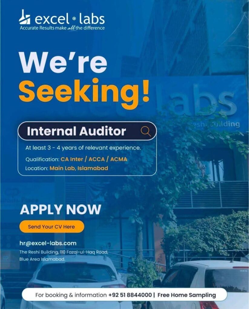 Excel Labs is hiring an Internal Auditor with 3-4 years of relevant experience. Required qualifications include CA Inter, ACCA, or ACMA. Apply now for the position at Main Lab, Islamabad.