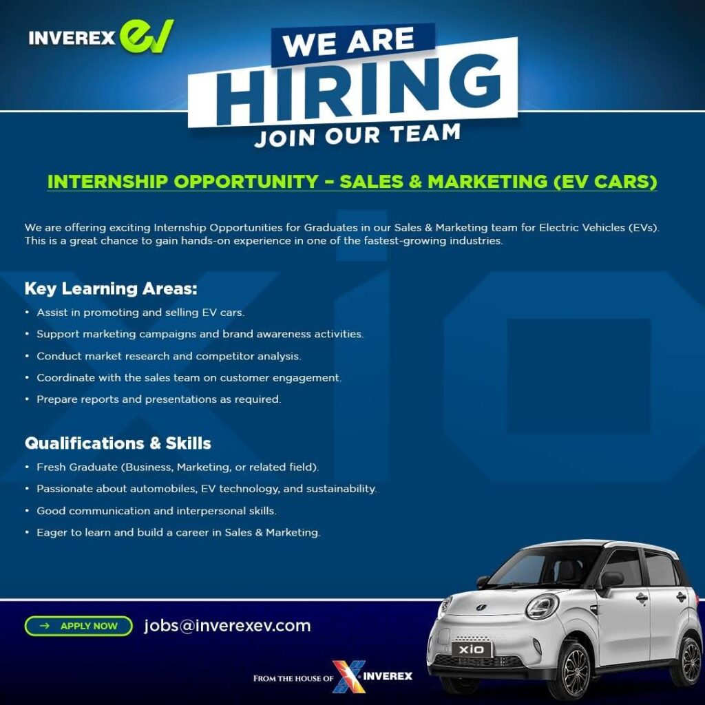 Inverex is hiring fresh graduates for an exciting internship opportunity in their Sales & Marketing team for Electric Vehicles (EVs). Gain hands-on experience in one of the fastest-growing industries, with a chance to build a career in sales and marketing for EV technology.