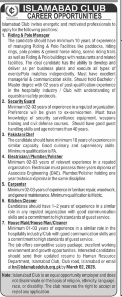Islamabad Club announces career opportunities 2026 including Riding & Polo Manager, Security Guard, Pakistani Chef, Electrician, Carpenter, Kitchen Cleaner, and House Staff. Apply before March 02, 2026.