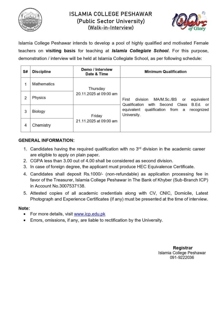 Apply for Islamia College Peshawar visiting lecturer jobs 2025. Female teachers required for Mathematics, Physics, Biology & Chemistry. Walk-in interview on 20–21 November 2025. Check qualifications, schedule, and application details.
