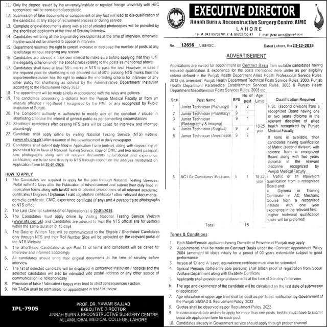 Jinnah Burn and Reconstructive Surgery Centre Lahore Jobs 2026 for Junior Technicians and Technical Staff Government Career Opportunity