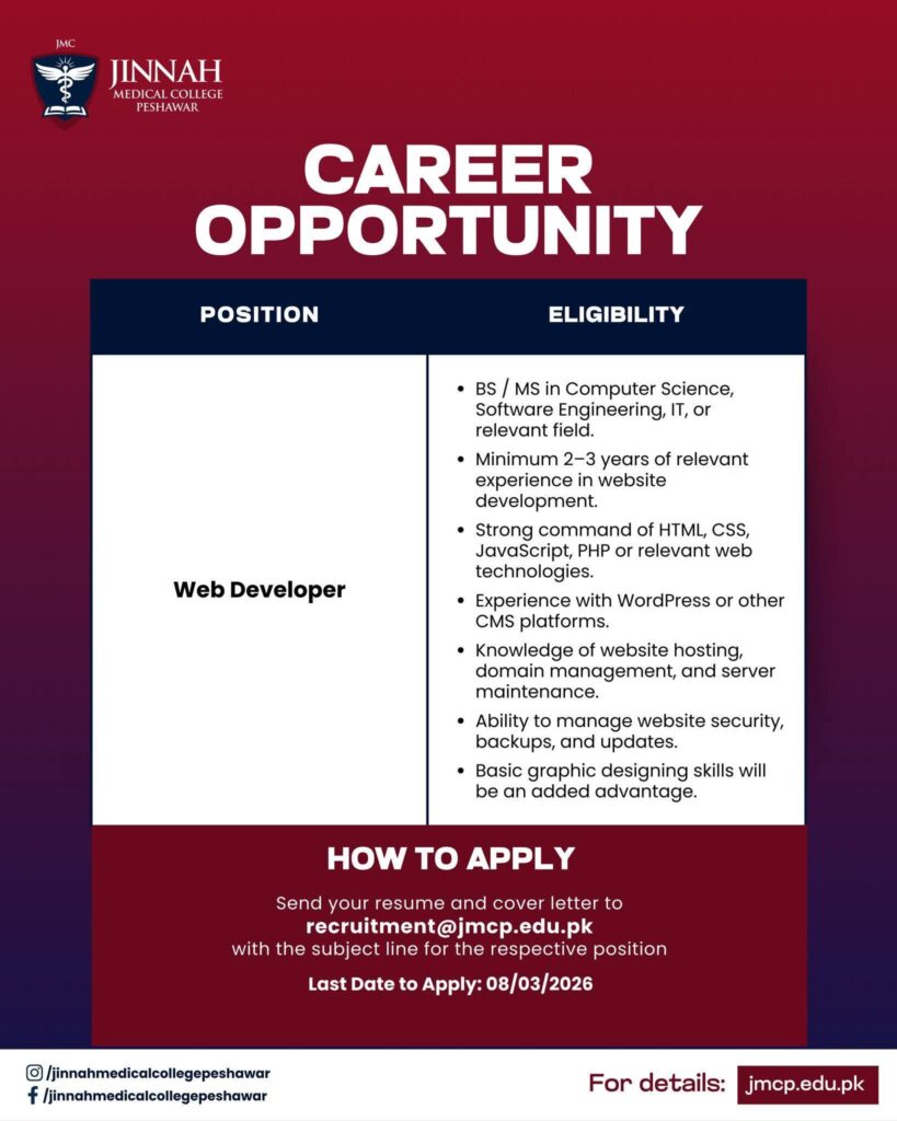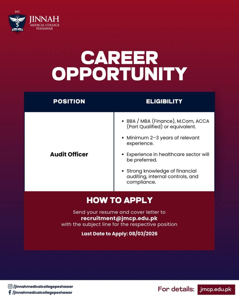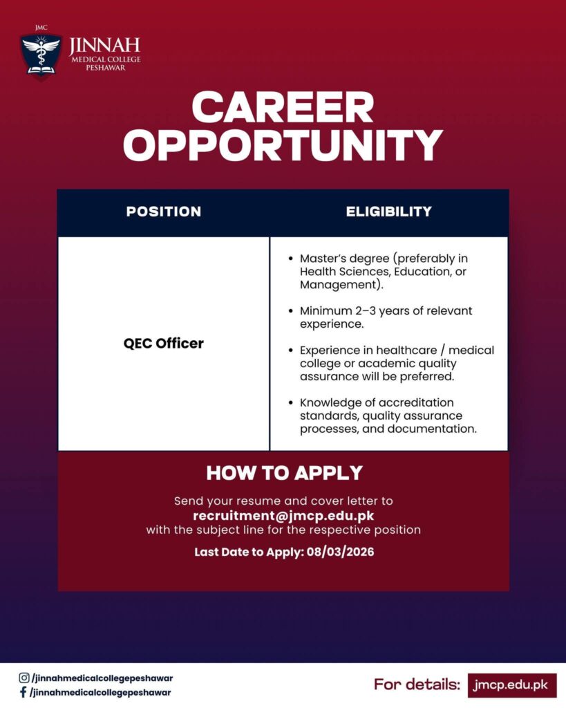 Jinnah Medical College Peshawar is offering career opportunities for Web Developer, QEC Officer, and Audit Officer positions. Candidates with relevant degrees in IT, management, finance, or health sciences and 2–3 years of experience can apply before 08 March 2026.