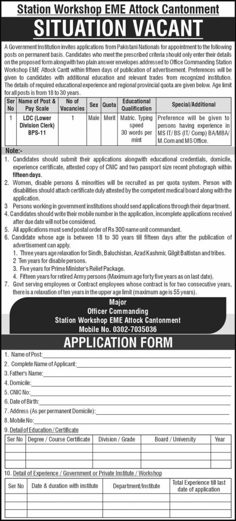 “Apply now for the LDC position at Station Workshop EME Attock Cantt. Male candidates with Matric and typing speed of 30 words per minute are eligible. Apply within 15 days from the advertisement date.”
