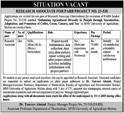 “Apply for the Research Associate position at MNS University of Agriculture Multan for PARB-funded project on enhancing agricultural diversity in Punjab. MSc in Horticulture required. Competitive salary and benefits. Apply now.”