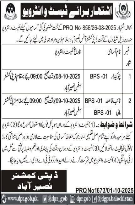 Dera Bugti, Naseerabad is hiring for multiple positions including Peon and Cleaner (BPS-01). Interested candidates can apply by attending the walk-in interview on 8th & 9th October 2025.
