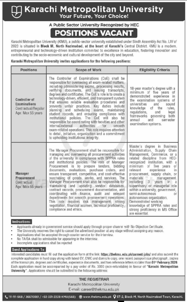 Apply for the Controller of Examinations and Manager Procurement positions at Karachi Metropolitan University. Check the qualifications, experience requirements, and application details for these roles before the deadline.