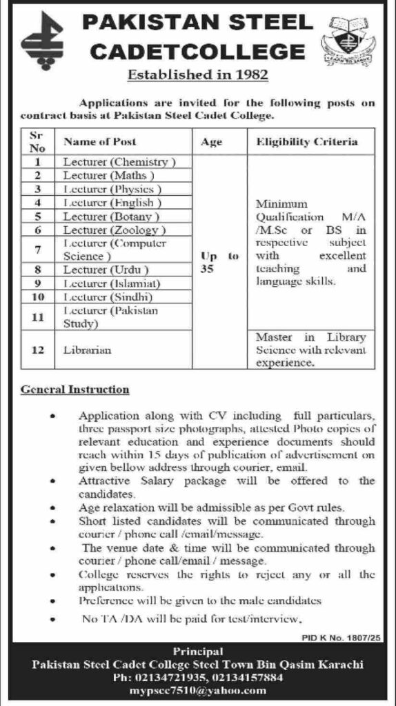 Explore career opportunities at Pakistan Steel Cadet College with available positions for Lecturers in various subjects and a Librarian role. Attractive salary packages, age relaxation, and career growth opportunities. Apply now!