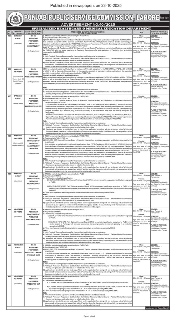 | Assistant Professor of Paediatric Gastroenterology | 01 | MBBS, FCPS, MD, MRCPCH, or equivalent in Gastroenterology | 25-45 years | Various Medical Colleges in Punjab |