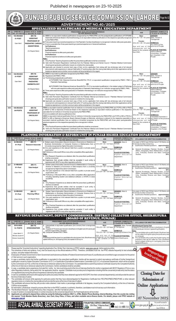 PPSC is hiring for multiple Assistant Professor positions in the Healthcare & Medical Education Department. Apply now for roles in various specialties like Pediatrics, Anesthesia, Dermatology, Microbiology, and more. Visit the PPSC website for details and application deadlines.