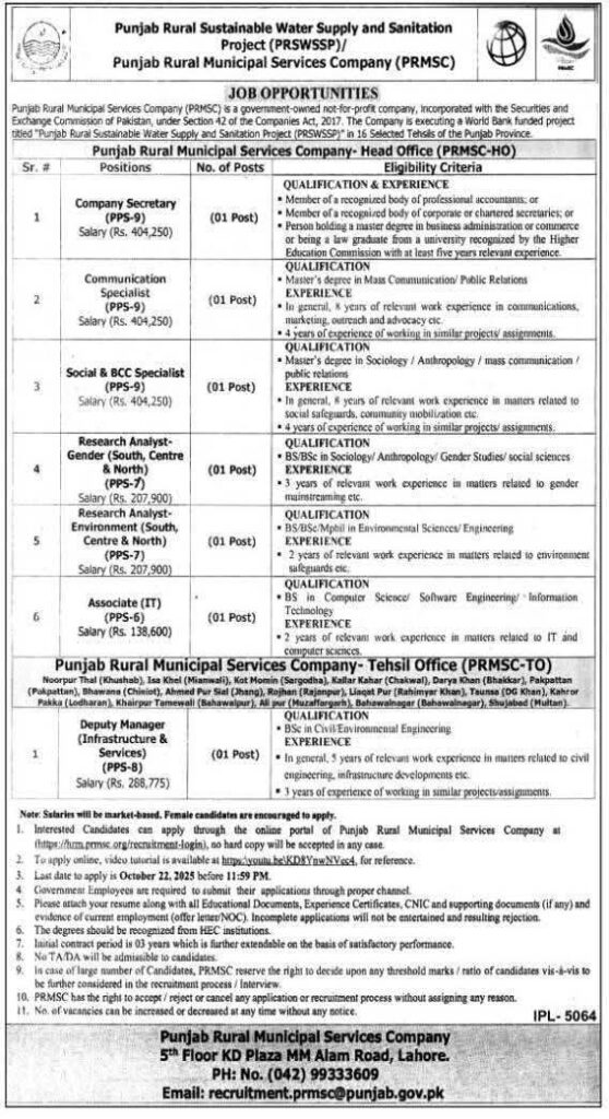 “Explore exciting job opportunities at Punjab Rural Municipal Services Company (PRMSC). Multiple positions available in various roles such as Company Secretary, Research Analyst, IT Associate, and more. Apply by October 31, 2025 for a rewarding career with competitive salaries.”